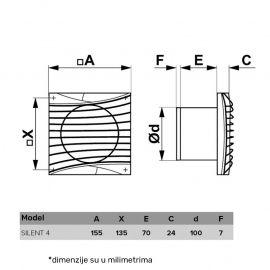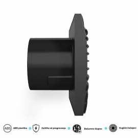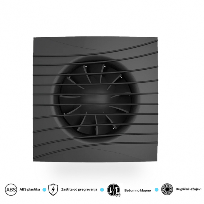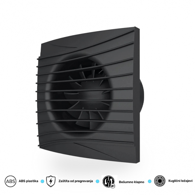 Nazivna snaga=8,4W | Nazivni napon=220-240V AC / 50/60Hz | Boja artikla=Mat crna | Dimenzije=Širina – 155mm, Visina – 155mm, Dubina – 108mm | IP zaštita=IP 24 | Buka (dbA)=25 dB | Protok vazduha (m3/h)=90 | Težina (kg)=0,6 kg | Materijal=ABS | Temperatura okruženja (ºC)=-5 °C do +40 °C | Dimenzije otvora za ugradnju=Ø 100 mm | Pritisak (Pa)=48 Pa | Artikal=Ventilator | Spoljni prečnik=100 mm | Transportno pakovanje=15 kom | Potrošnja elek. energije:=84kW/1000h