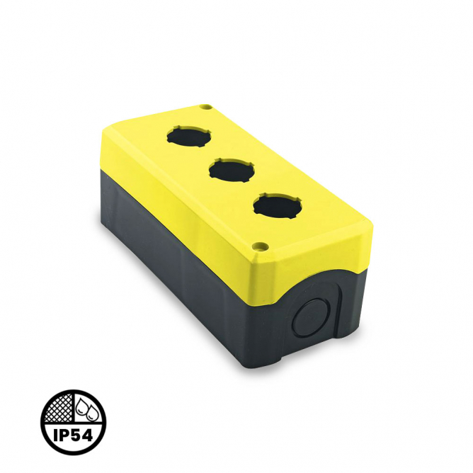Boja artikla=Crno-žuta | Dimenzije=70 x 150 x 65 mm | IP zaštita=IP 54 | Materijal=ABS | Model / tip=BX3-22 trostruka | Dimenzije otvora za ugradnju=Ø 22 mm otvor za prekidač/taster | Artikal=kutija za taster / prekidač