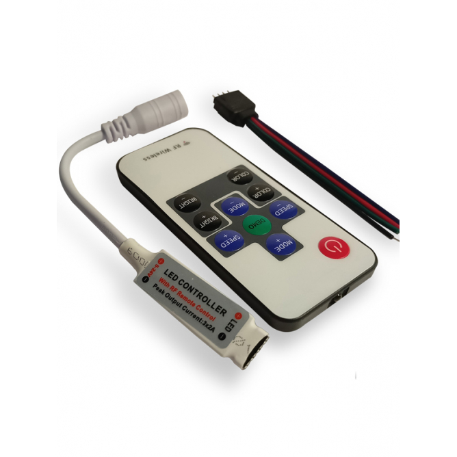 Dimenzije=Kontrola 40 X 12 X 6 mm, daljinski 87 X 40 X 6 | IP zaštita=IP 20 | Materijal=PC | Temperatura okruženja (ºC)=-20 °C do +60 °C | Nazivna izlazna struja=6 A | Nazivni ulazni napon=5 – 24 V DC | Artikal=kontroler
