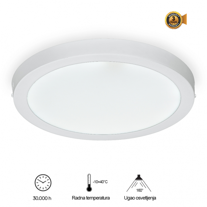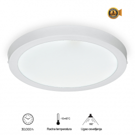 Nazivna snaga=36 W | Nazivni napon=85-265 V AC | Izvor svetlosti=LED | Svetlosni fluks=3600 lm | Temperatura boje svetlosti=6500 K | Boja artikla=Bela | Prosečan radni vek=30 000 h na 25° C | Dimenzije=Ø 400 mm, h – 40 mm | Ugao rasipanja svetlosti=160° | IP zaštita=IP 20 | Način / tip montaže=nadgradna | Indeks reprodukcije boje (CRI)=≥80(Ra) | Materijal=Aluminijum/PS | Energetska efikasnost=A+ | Dimabilnost=Ne | Temperatura okruženja (ºC)=-10 °C do +40 °C | Difuzor=LGP PS | Stepen električne zaštite=Klasa II | Model / tip=KNC5-36W | Artikal=LED panel, nadgradni | Transportno pakovanje=10 kom | Potrošnja elek. energije:=36 Kwh / 1000h