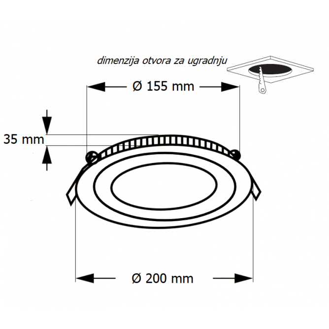 Nazivna snaga=18 W | Nazivni napon=220-240V AC / 50/60Hz | Izvor svetlosti=LED | Svetlosni fluks=1440 lm | Temperatura boje svetlosti=4000 K | Boja artikla=Bela | Prosečan radni vek=30 000 h na 25° C | Dimenzije=Ø 200 mm, h – 35 mm | Ugao rasipanja svetlosti=120° | IP zaštita=IP 20 | Način / tip montaže=ugradna | Indeks reprodukcije boje (CRI)=≥80(Ra) | Materijal=Aluminijum / staklo | Energetska efikasnost=A+ | Dimabilnost=Ne | Temperatura okruženja (ºC)=-10 °C do +40 °C | Difuzor=LGP PS | Stepen električne zaštite=Klasa II | Model / tip=KNC2-18W | Dimenzije otvora za ugradnju=Ø 155 mm | Artikal=LED panel, ugradni | Potrošnja elek. energije:=18 Kwh / 1000h
