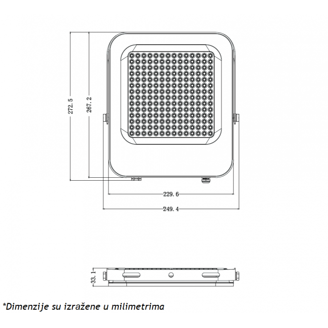 Nazivna snaga=150 W | Nazivni napon=220-240V AC / 50/60Hz | Izvor svetlosti=LED | Svetlosni fluks=13500 lm | Temperatura boje svetlosti=6500 K | Boja artikla=Crna | Prosečan radni vek=25 000 h | Dimenzije=249.4 x 272.5 x 33.1 mm | Ugao rasipanja svetlosti=90° | IP zaštita=IP 65 | Način / tip montaže=nadgradna | Indeks reprodukcije boje (CRI)=≥80(Ra) | Faktor snage (pf)=0.9 | Materijal=Aluminijum | Dimabilnost=Ne | Temperatura okruženja (ºC)=-20 °C do +40 °C | Stepen električne zaštite=Klasa I | Model / tip=IK03 – 150W | Stepen mehaničke zaštite=IK 07 | Artikal=LED reflektor | Transportno pakovanje=5 kom | Potrošnja elek. energije:=150 kWh / 1000h