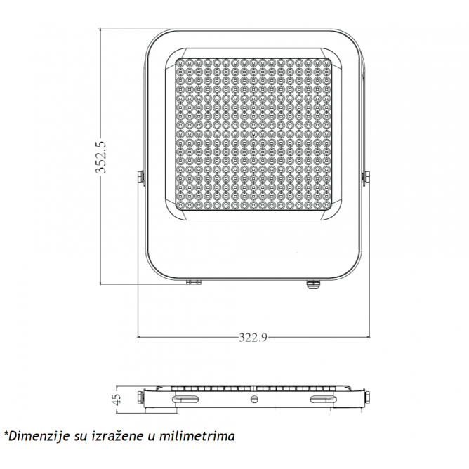 Nazivna snaga=300 W | Nazivni napon=220-240V AC / 50/60Hz | Izvor svetlosti=LED | Svetlosni fluks=27000 lm | Temperatura boje svetlosti=6500 K | Boja artikla=Crna | Prosečan radni vek=25 000 h | Dimenzije=322.9 x 352.5 x 45 mm | Ugao rasipanja svetlosti=90° | IP zaštita=IP 65 | Način / tip montaže=nadgradna | Indeks reprodukcije boje (CRI)=≥80(Ra) | Faktor snage (pf)=0.9 | Materijal=Aluminijum | Dimabilnost=Ne | Temperatura okruženja (ºC)=-20 °C do +40 °C | Stepen električne zaštite=Klasa I | Model / tip=IK03 – 300W | Stepen mehaničke zaštite=IK 07 | Artikal=LED reflektor | Transportno pakovanje=5 kom | Potrošnja elek. energije:=300 kWh / 1000h