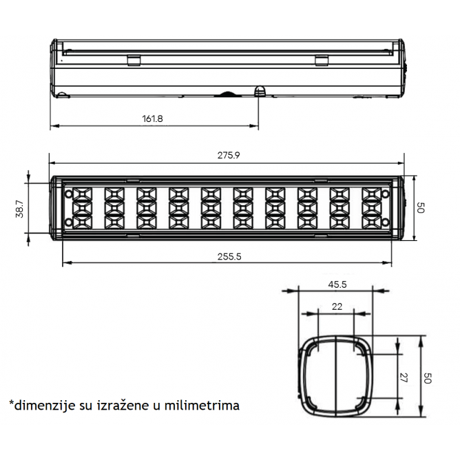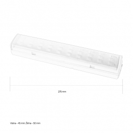 Nazivni napon=200-240 V AC | Izvor svetlosti=SMD 3528 (30 x 0,07W) | Svetlosni fluks=126/86lm | Temperatura boje svetlosti=6500 K | Boja artikla=Bela | Prosečan radni vek=20 000 h na 25° C | Dimenzije=275.9 x 50 x 45.5 mm | Ugao rasipanja svetlosti=120° | IP zaštita=IP 20 | Način / tip montaže=nadgradna | Materijal=ABS | Temperatura okruženja (ºC)=0 °C do +40 °C | Stepen električne zaštite=Klasa II | Model / tip=30 LED SMD | Vreme rada=do 6h slabo osvetljenje, do 3h jako osvetljenje | Baterija=3.7 V / 1.3 Ah Li-Ion | Vreme punjenja=3 – 6 h | Artikal=panik (punjiva) lampa | Transportno pakovanje=24 kom