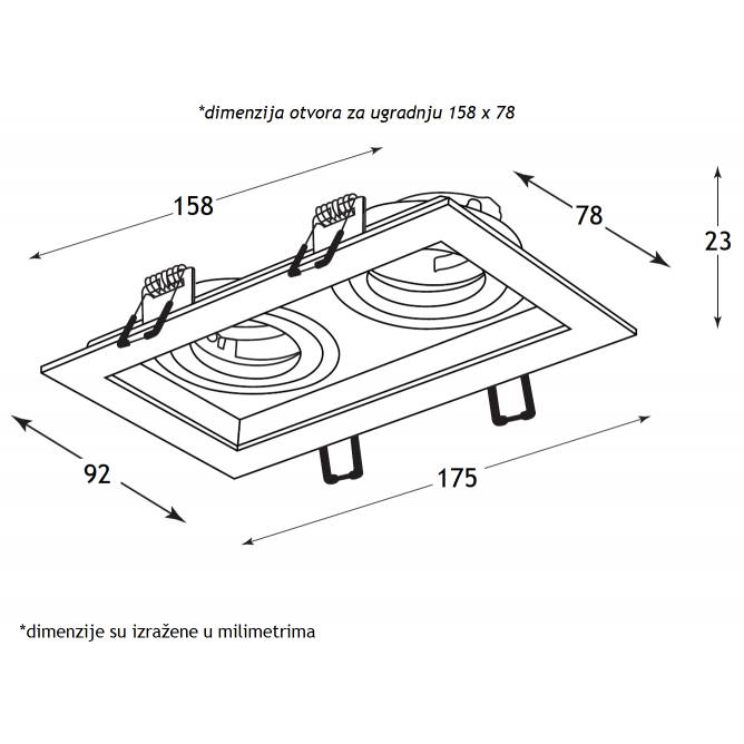 Nazivni napon=220-240V AC / 50/60Hz | Izvor svetlosti=Sijalica (izmenjiva) | Boja artikla=Bela | Dimenzije=175 x 92 x 23 mm | IP zaštita=IP 20 | Način / tip montaže=ugradna | Materijal=Aluminijum | Stepen električne zaštite=Klasa II | Tip grla=GU 10 | Model / tip=četvrtasta – rotirajuća | Broj grla=2 | Dimenzije otvora za ugradnju=158 x 78 mm | Artikal=rozetna