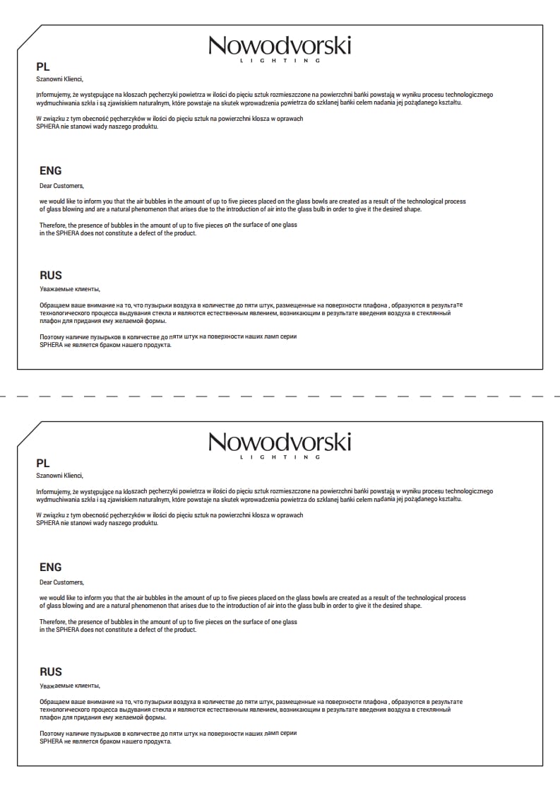 Isporuka za NOWODVORSKI RASVETU čeka se okvirno 2 nedelje u zavisnosti od stanja, za njihove proizvode potrebna avansna uplata u iznosu od 50%.