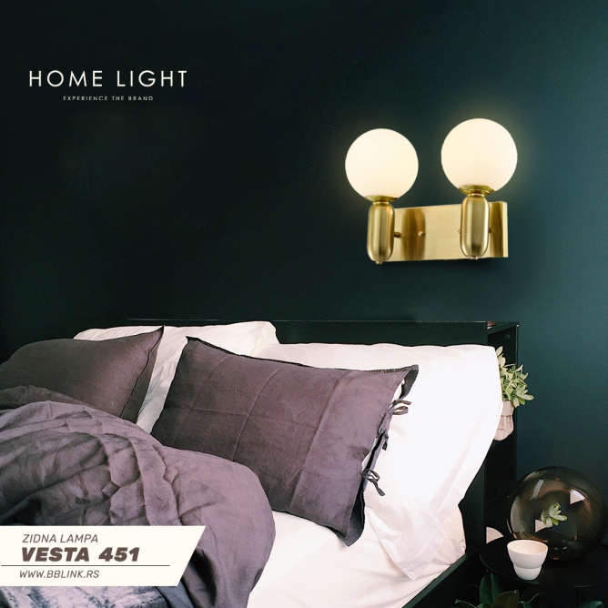 Nazivni napon=220-240V AC / 50/60Hz | Izvor svetlosti=Sijalica (izmenjiva) | Boja artikla=mesing-zlatna | Dimenzije=Dužina – 390; Širina – 180; Visina – 330mm | IP zaštita=IP 20 | Način / tip montaže=nadgradna | Materijal=Aluminijum / staklo | Stepen električne zaštite=Klasa I | Tip grla=E 14 | Model / tip=VESTA 451 | Broj grla=2 | Artikal=Zidna lampa | Boja kugle=Mlečno bela | Linija proizvoda=Home Light – dekorativna rasveta